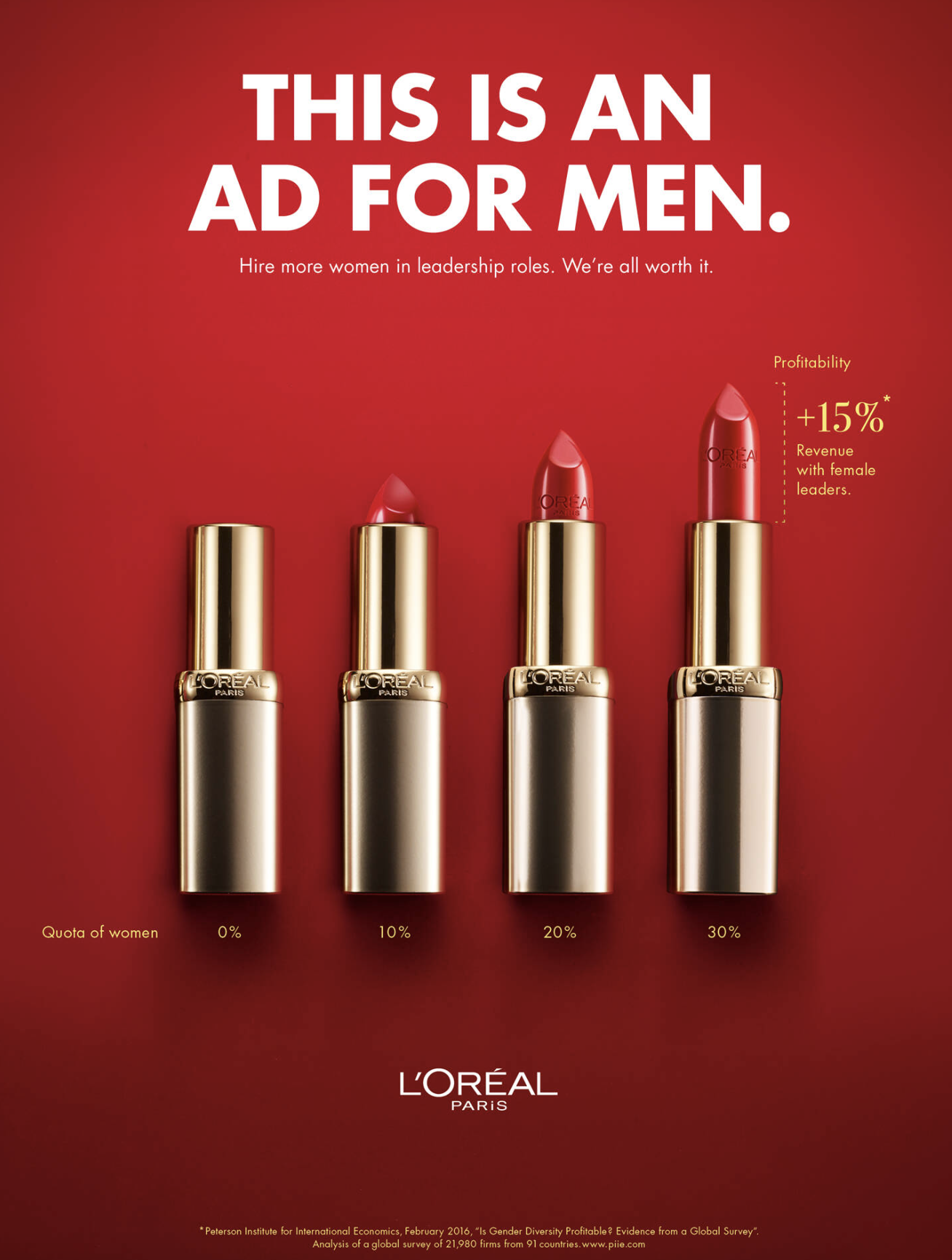 In a clever print ad from L’Oréal, we get a lipstick bar graph, along with an attention-grabbing line of copy: “This is an ad for men.” The ad presents statistical information, targeted at men, encouraging the promotion of women. With its bold copy, we can tell this is no ordinary cosmetics ad.