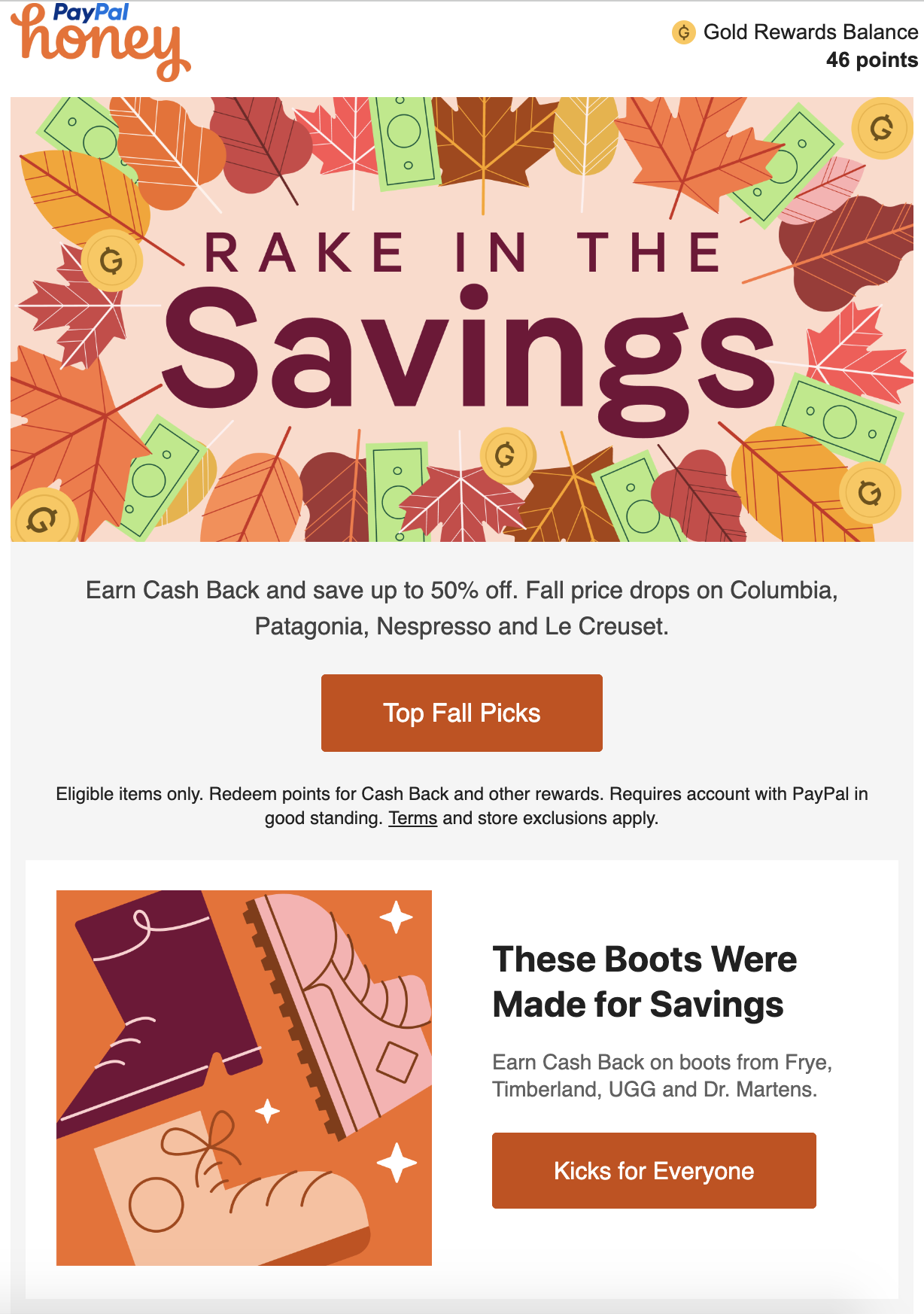 This copywriting example is an email from Honey, and it uses wordplay throughout. “Rake in the savings” is clever because of the fall theme, and the email also uses pop-culture references as well as playful, modern language.
