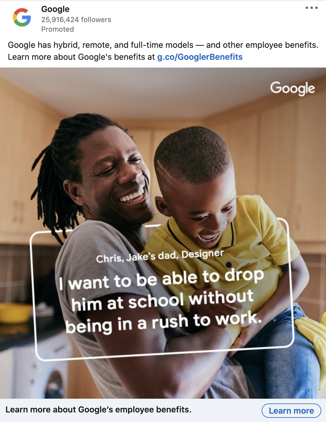 Here, Google advertises one of its major benefits: work-life balance. Instead of traditional copy, this digital ad features a quote from a hypothetical employee. Notice how the copy also calls him “Jake’s dad” first and a “designer” second, further emphasizing that Google prioritizes people’s lives over the grind.